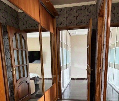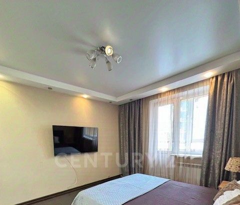 В зоне комнаты - двухспальная кровать, вместительный шкаф-купе. Телевизор.