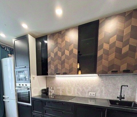 Зона кухни оснащена встроенной мебелью, холодильником, варочной панелью, духовым шкафом, посудой.