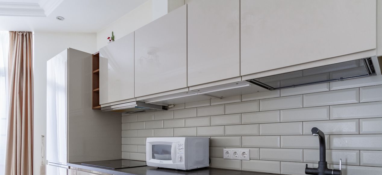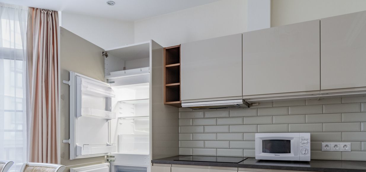 На кухне есть вся необходимая техника: холодильник, духовка, микроволновка, посудомойка, телевизор.