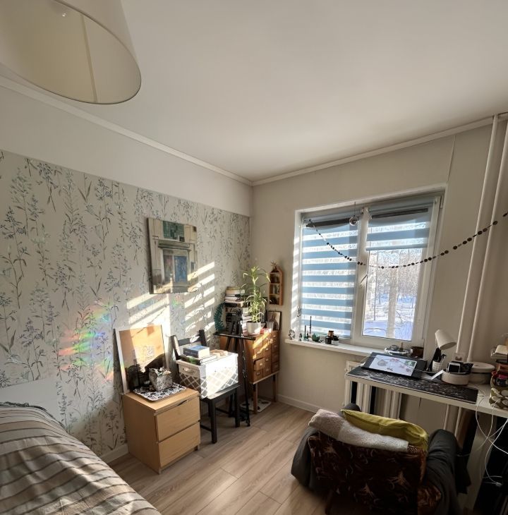 Атмосфера: Квартира очень теплая и невероятно солнечная (окна выходят во двор и на зелень). Вид из окна — просто сказка! Прямо перед домом растут высокие деревья, создавая ощущение, что вы живете в лесном массиве, а не в городе. Двор тихий, закрытый от шума проспекта.