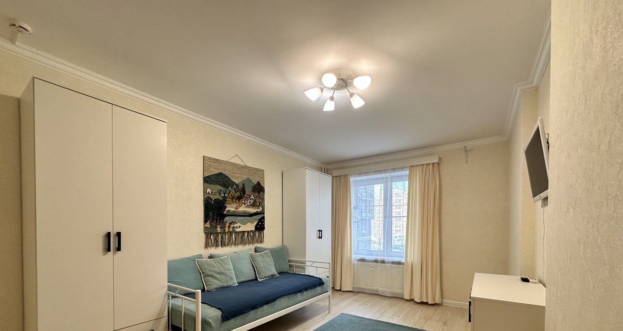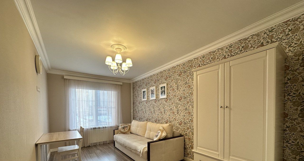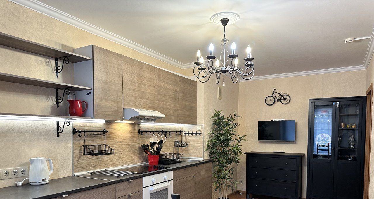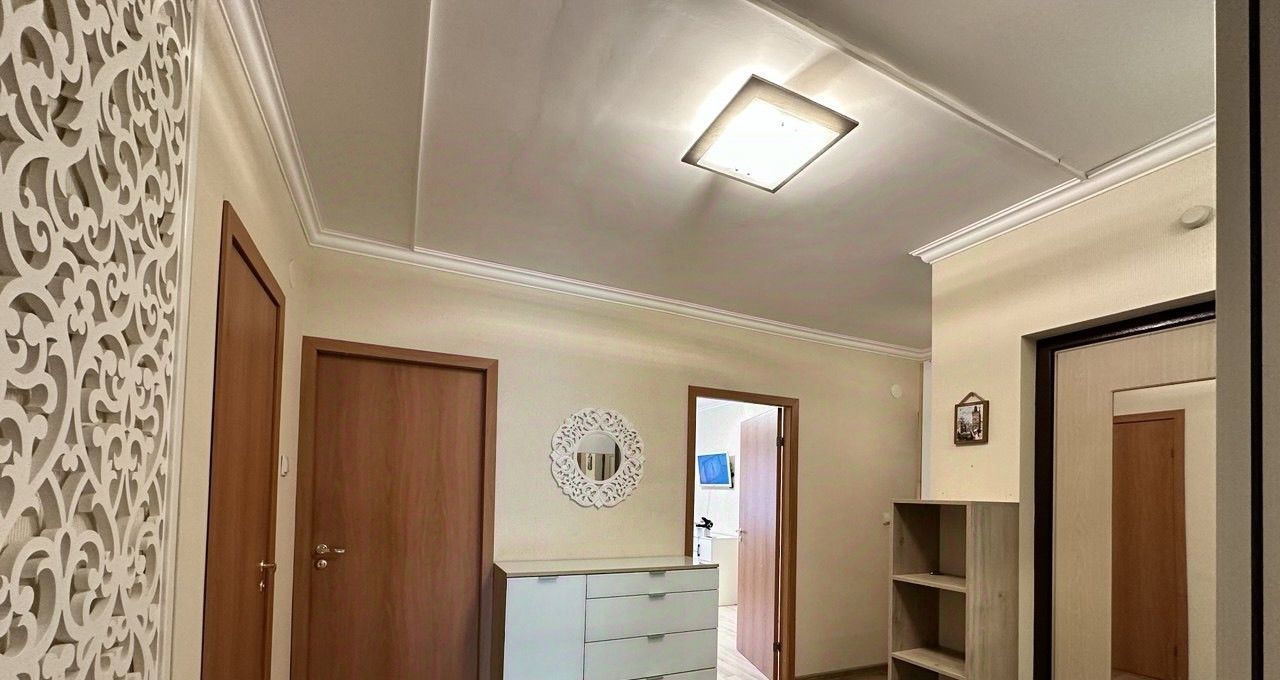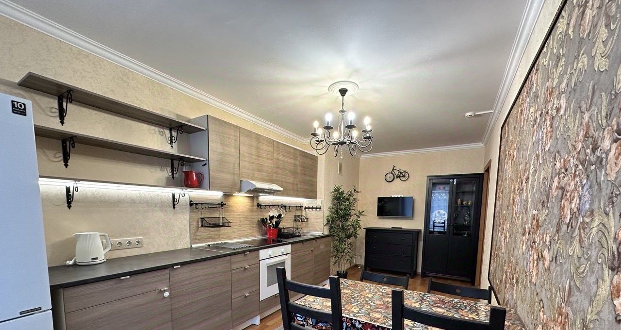 В квартире сделан современный евроремонт, установлена мебель как в комнатах, так и на кухне. Из техники есть все необходимое для комфортной жизни: холодильник, посудомоечная и стиральная машины, телевизор. Санузел раздельный, ванна. Окна выходят во двор, что обеспечивает тишину и спокойствие. Высота потолков — 2.6 метра, что создает ощущение простора.