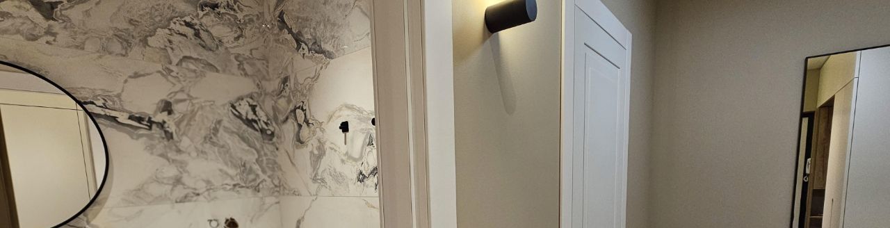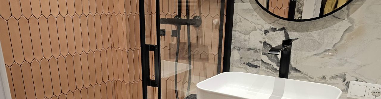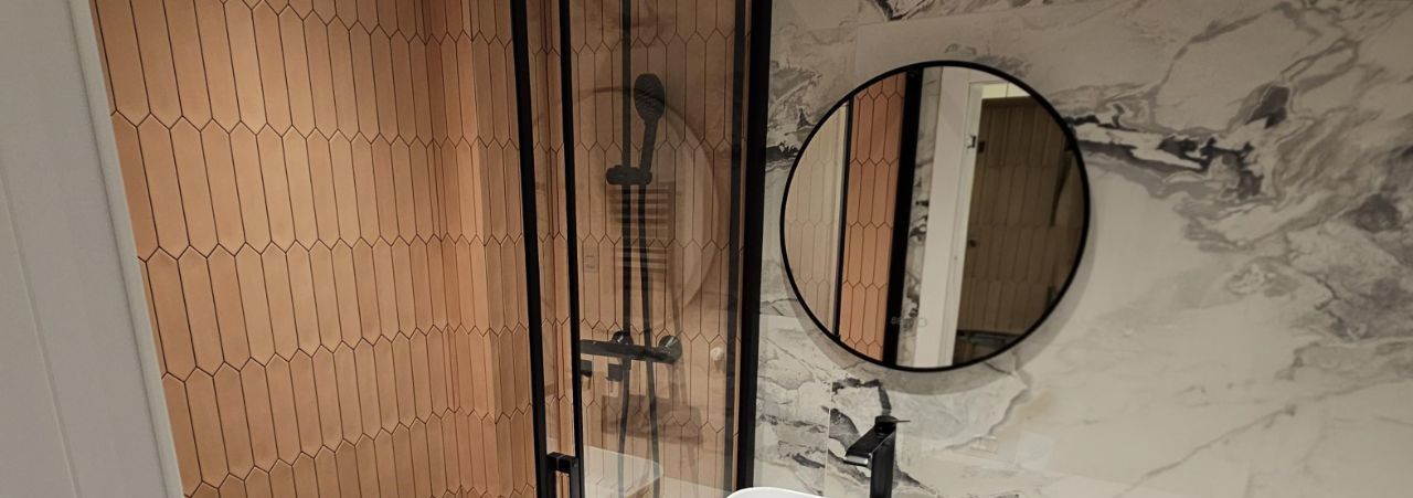 Современная плитка с мраморной фактурой, чёрная сантехника и аксессуары — интерьер выглядит дороже и аккуратнее стандартных новостроечных ремонтов.