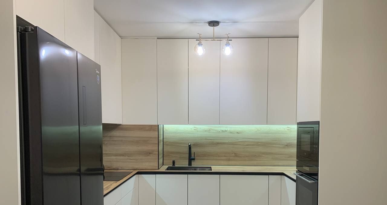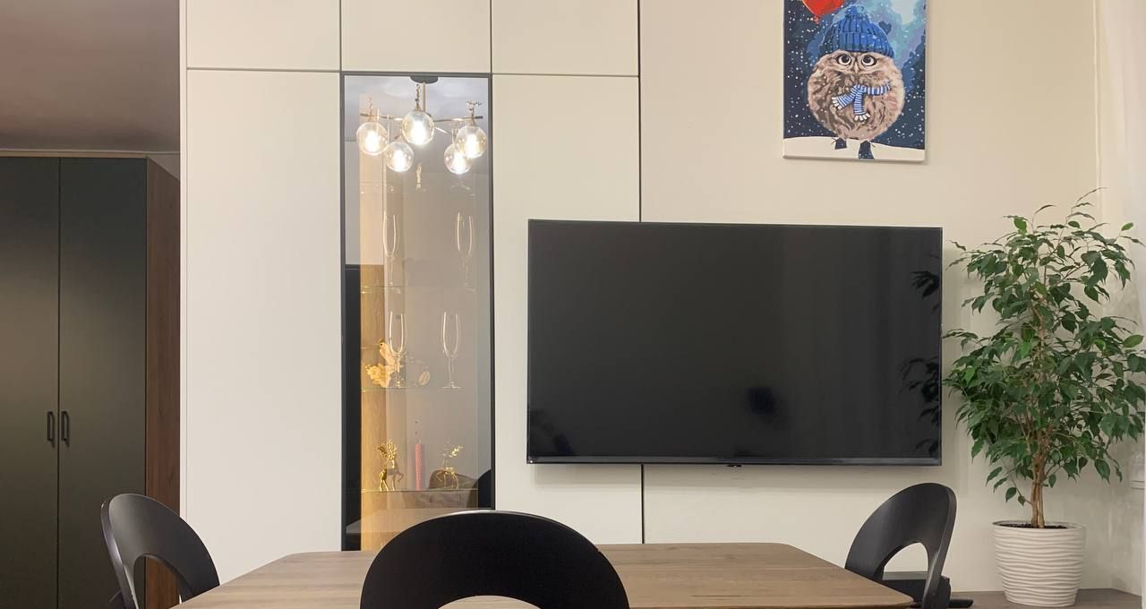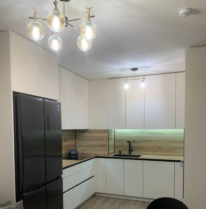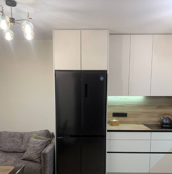 - Бытовая техника: xолoдильник, варочная панель, духовка, вытяжка, микроволновка, посудомоечная машина, телевизор, стиральная машина, сушильная машина