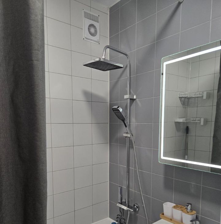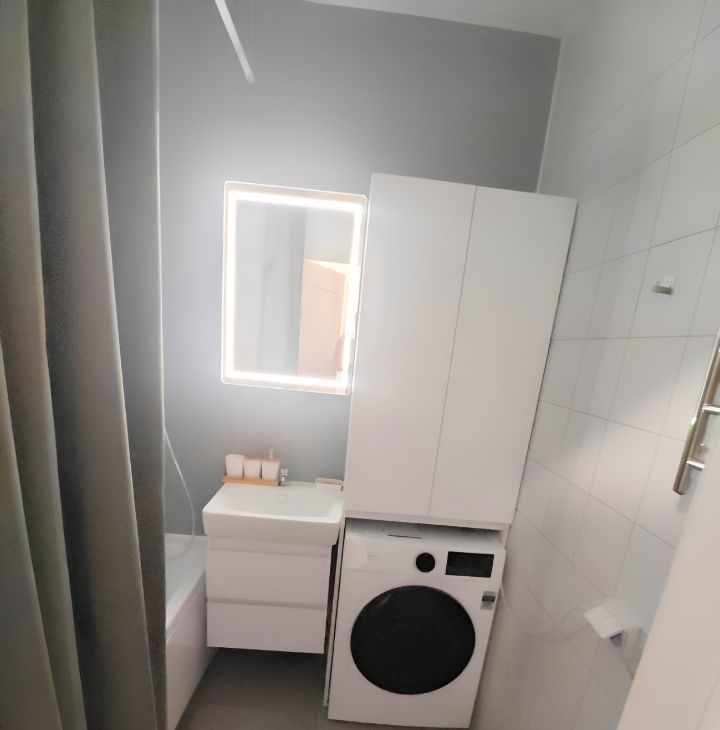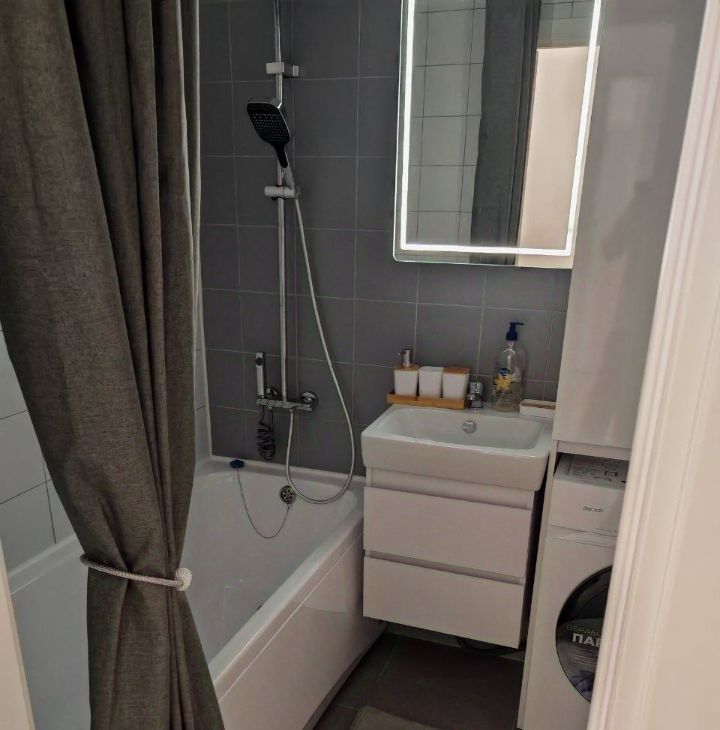 Ванная с тропическим душем и подсветкой зеркала, стиральная машина