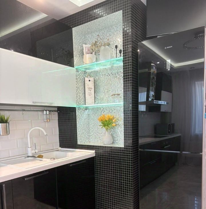 Кухня площадью 16 мг оборудована современной техникой Bosh, включая посудомоечную машину и холодильник (стеклянный Bosh). Фасады кухонного гарнитура выполнены из закалённого стекла (подбирались к холодильнику), вся фурнитура австрийская-