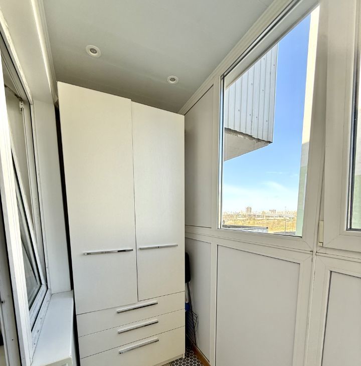 — балкон с остеклением и освещением, на полу плитка, установлен шкаф для хранения. Окна выходят на тихую часть двора.
