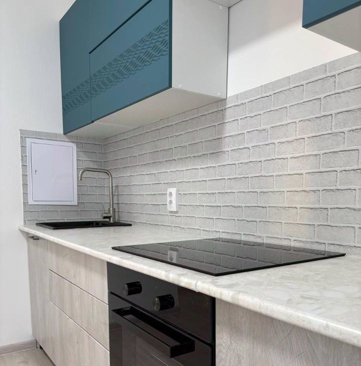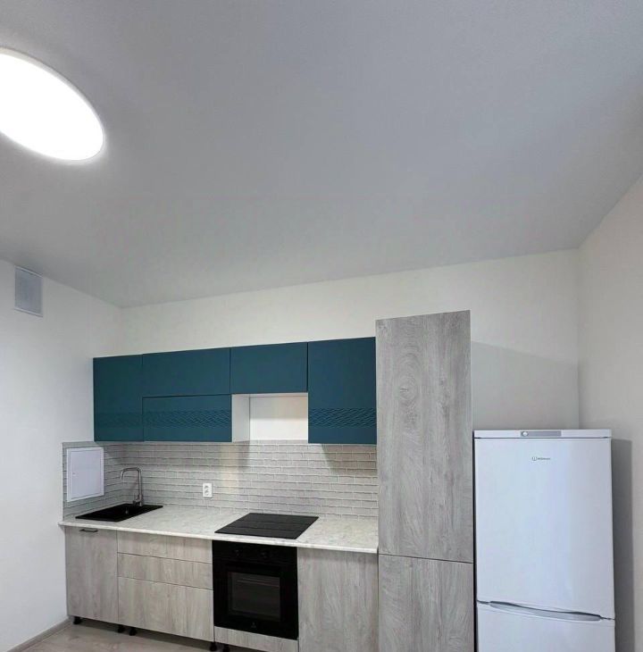 Кухня: холодильник, духовой шкаф, варочная панель, холодильник,обеденный стол со стульями, кухонный гарнитур.