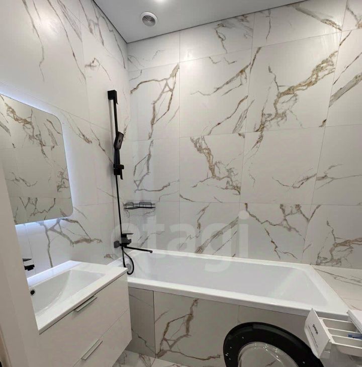 Санузел раздельный, ванная комната светлая, установлена стиральная машина.
