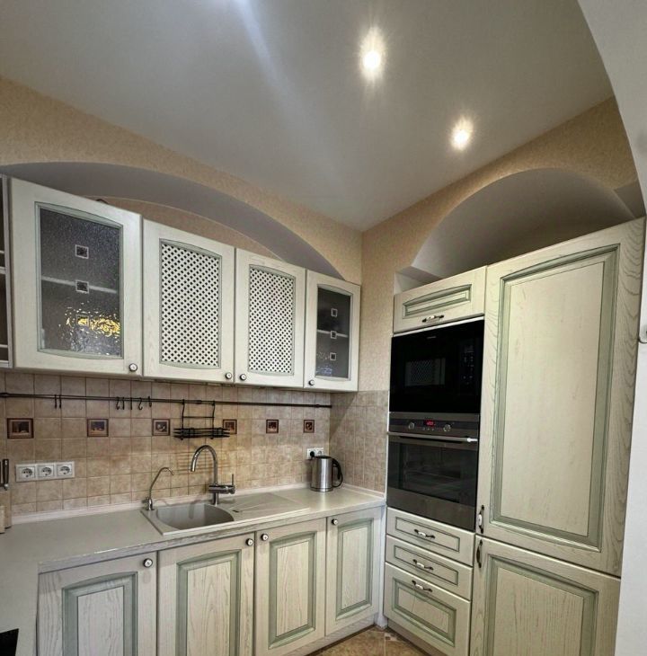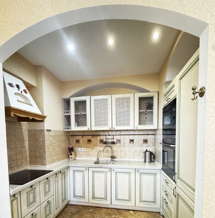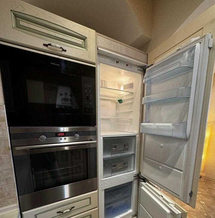 Качественная техника, представленная в квартире, включает в себя варочную панель, духовой шкаф, холодильник и телевизор.