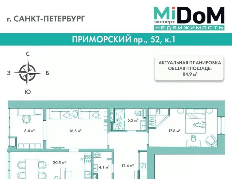 2-к кв. Санкт-Петербург Приморский просп., 52К1 (84.9 м²)