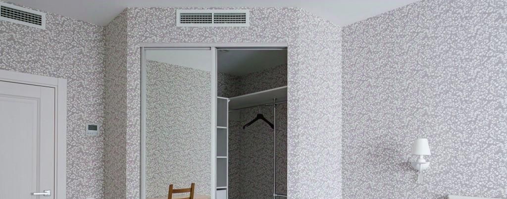 В спальне располагается удобная двуспальная кровать. Для вещей отдельно сделана гардеробная. Это значительно удобнее любого шкафа, дает больше пространства для хранения.