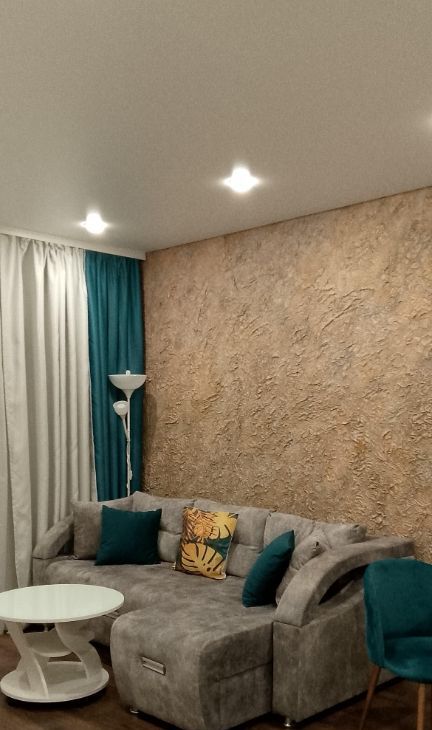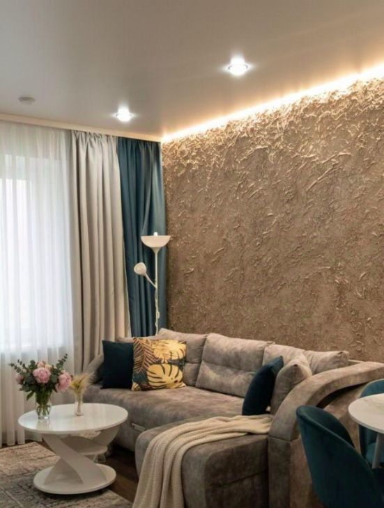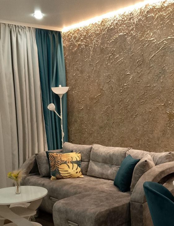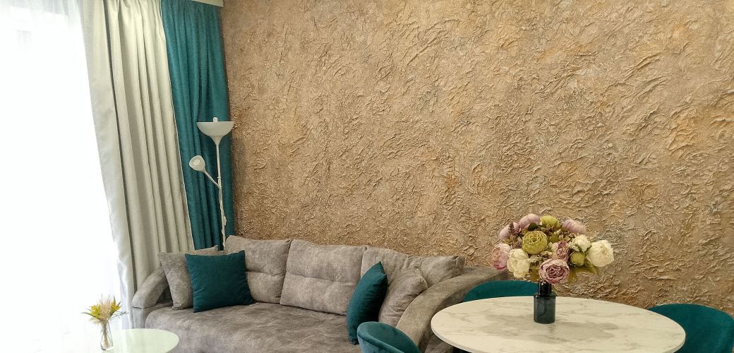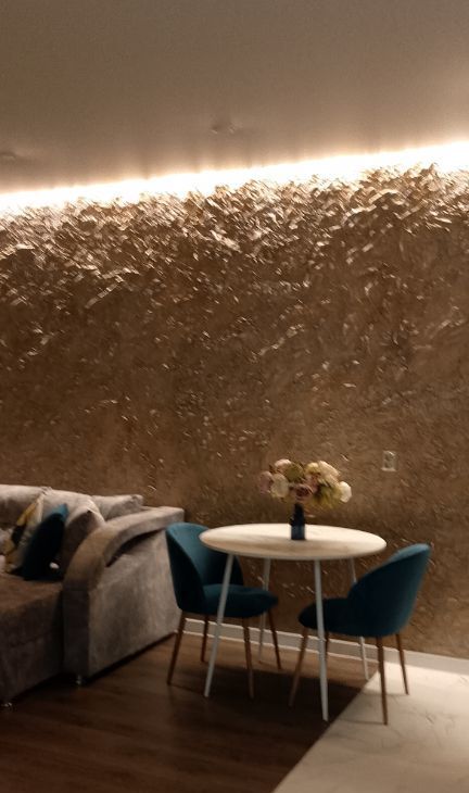 Все стены выполнены дорогой красивой декоративной штукатуркой. Стены не только красивые, но и антивандальные, что позволяет спокойно заводить домашних питомцев и не переживать за ремонт.