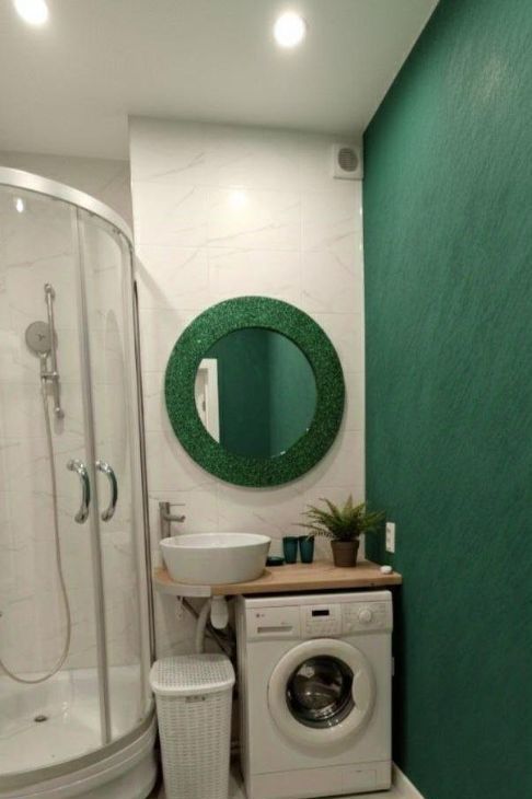 Современный санузел совмещенный, оборудован душевой кабиной, унитазом и стиральной машиной.