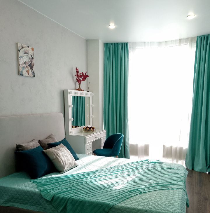 В квартире панорамные окна и застекленная лоджия, что добавляет много света.