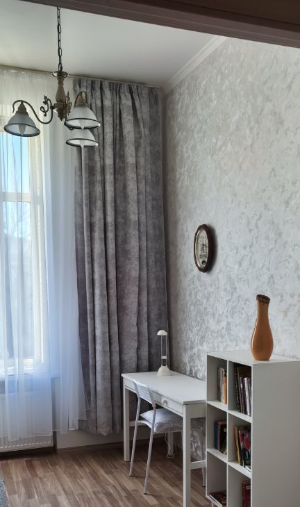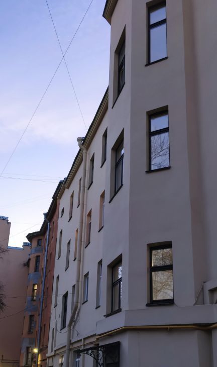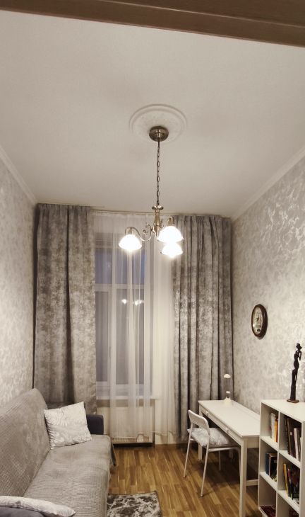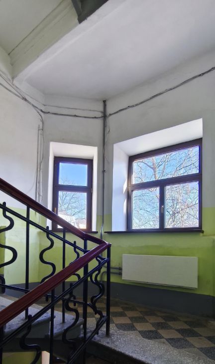 Квартира располагается на втором этаже четырехэтажного дома. Общая площадь квартиры составляет 54 квадратных метра, жилая площадь — 25 квадратных метров, а кухня — 10 квадратных метров. Высокие потолки (3,2 метра) добавляют пространству воздуха и света, а окна выходят на Большой проспект.
