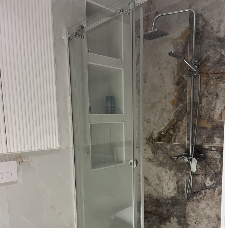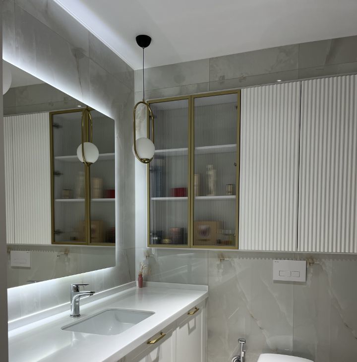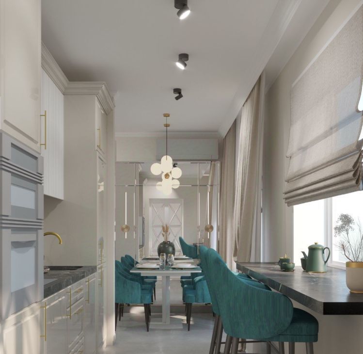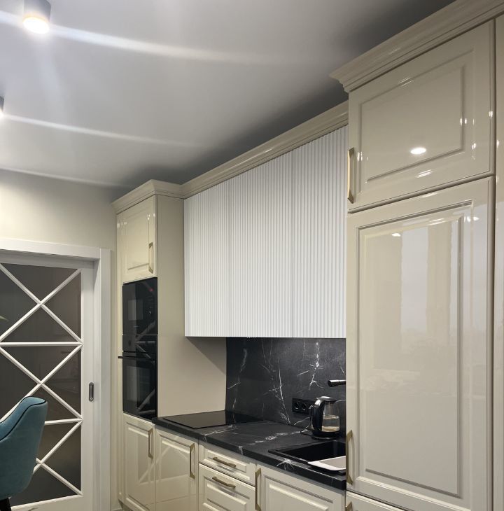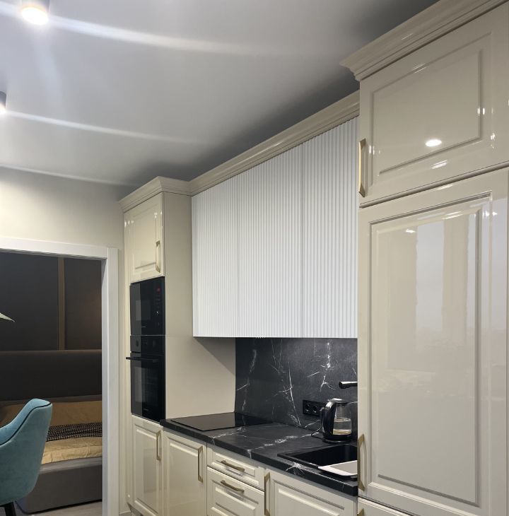 Квартира полностью оснащена импортной бытовой техникой (варочная панель, духовой шкаф, холодильник, стиральная машина, вытяжка, кондиционер 9 тепло-холод), подключен интернет. Имеется отдельная вместительная гардеробная с системой хранения Titan.