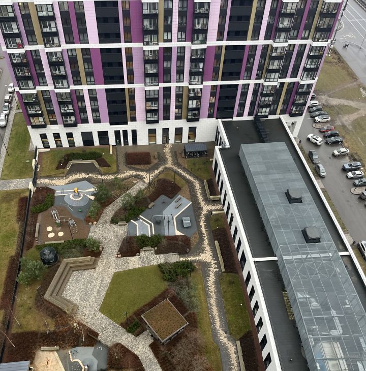 Ландшафтный дизайн во дворе: детские площадки, зоны отдыха, рабочие зоны с лавочками и столами в беседках, озеленение в летний период, безоплатный wi-fi по всей территории ЖК (кроме квартир) и в нескольких метрах за его пределами.