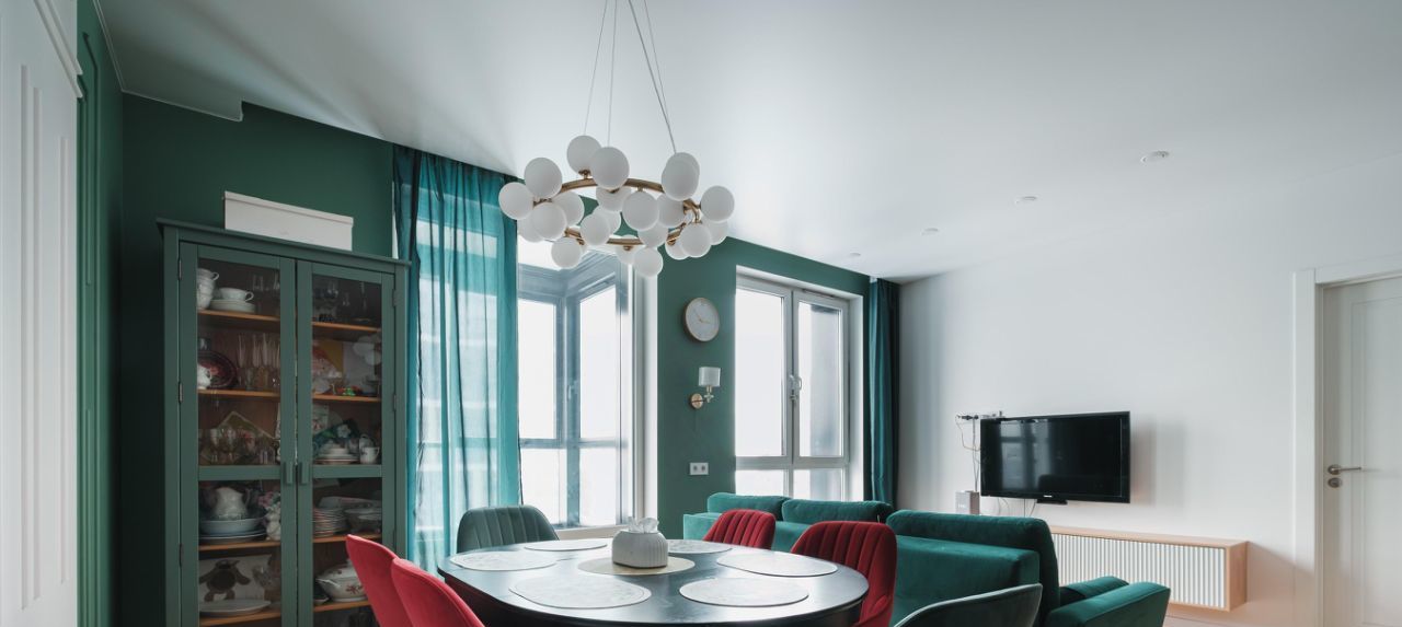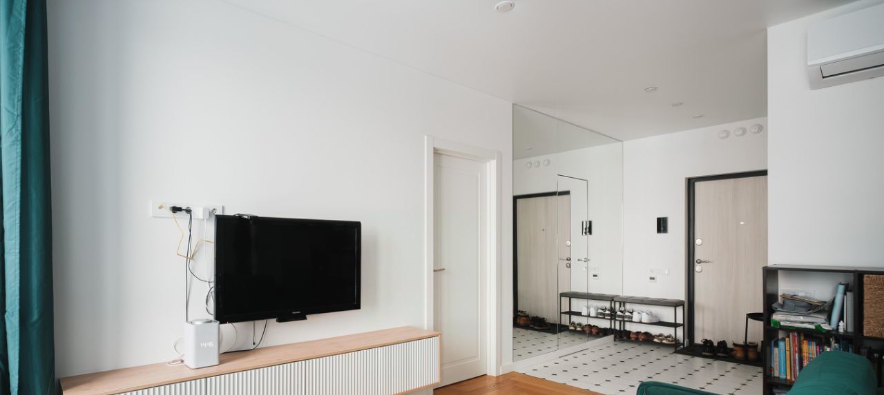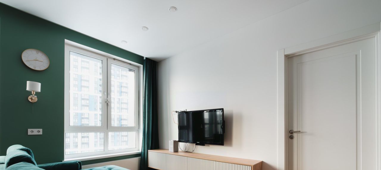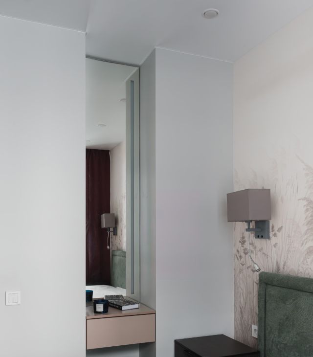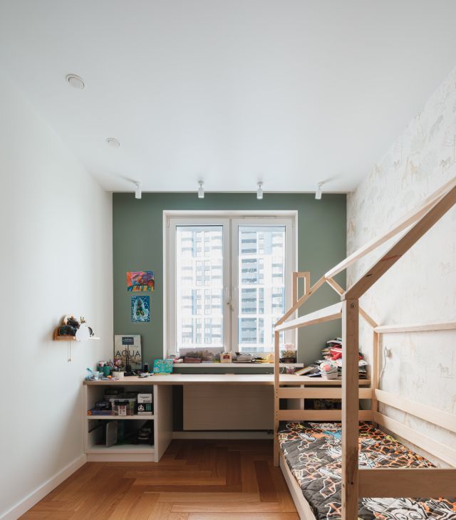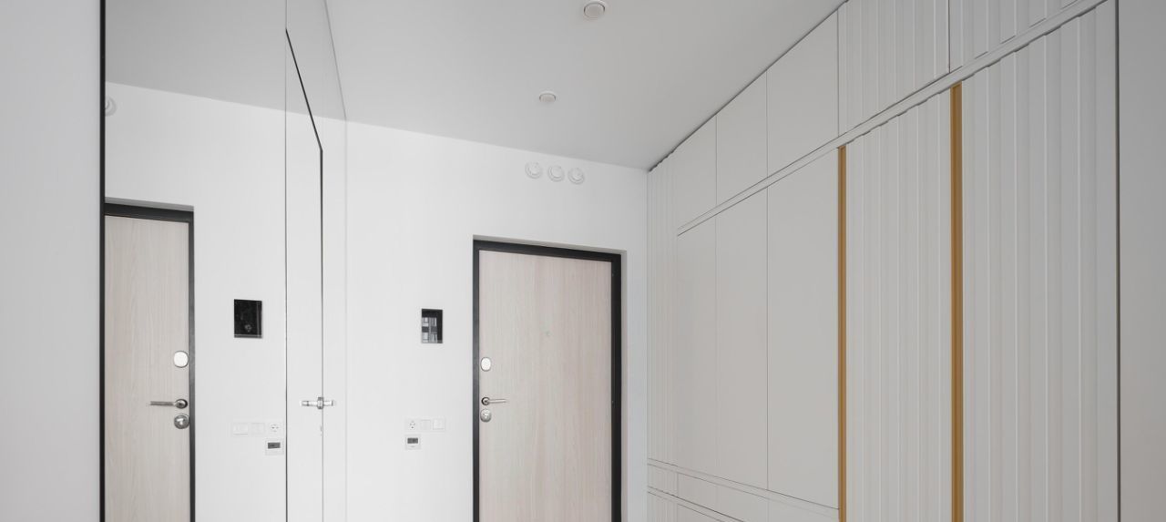 Дизайнерский ремонт в современном стиле, покрытие пола - инженерная доска, крашеные стены, фасады корпусной мебели - эмаль.