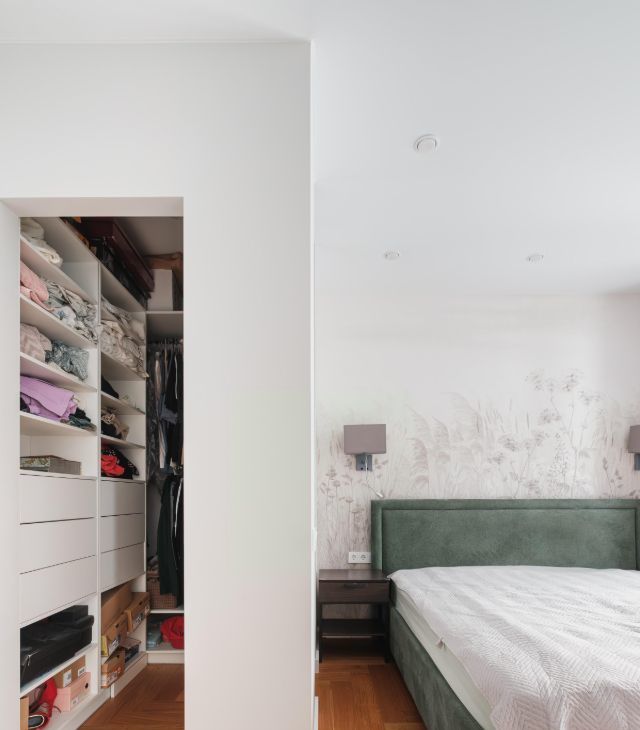 Изолированная планировка, 2 санузла( каждый 4.8 квм), один из которых выходит в мастер-спальню (12квм, организована гардеробная),