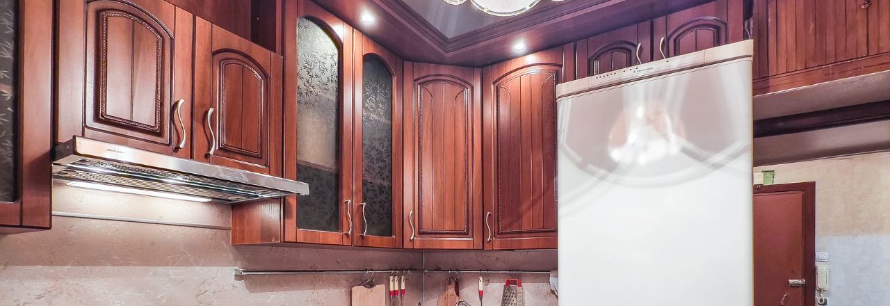 На кухне - двухкамерный холодильник, гарнитур, варочная поверхность (духовой шкаф не рабочий), вытяжка, обеденный стол с табуретами.