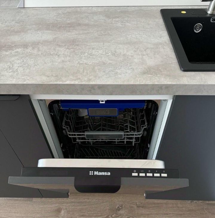 -новая современная кухня со встроенной техникой (посуломойка, посуда).