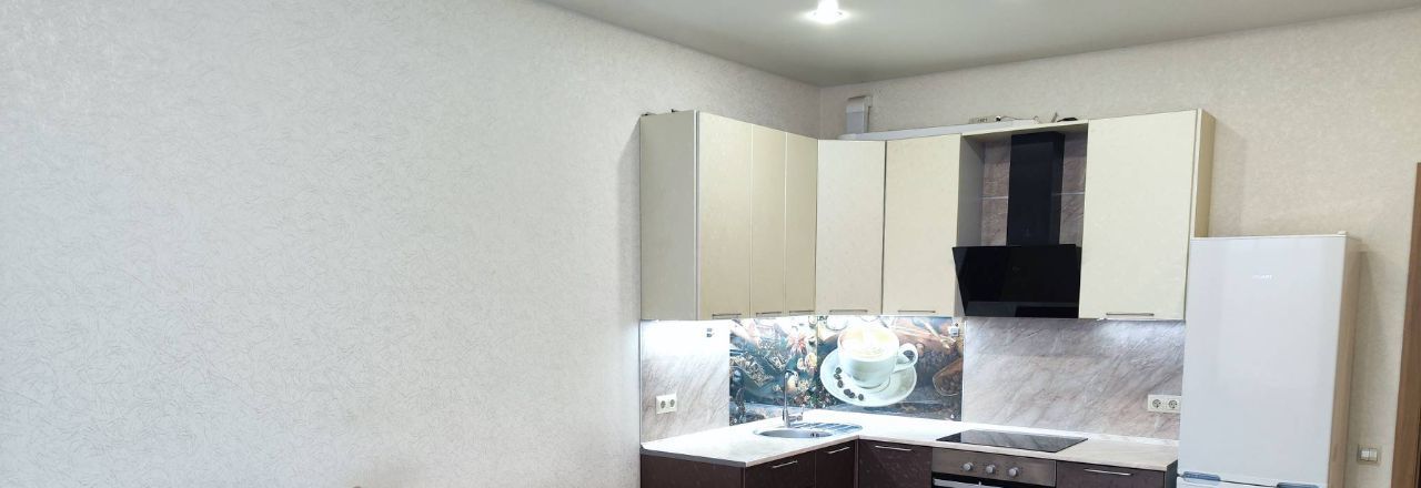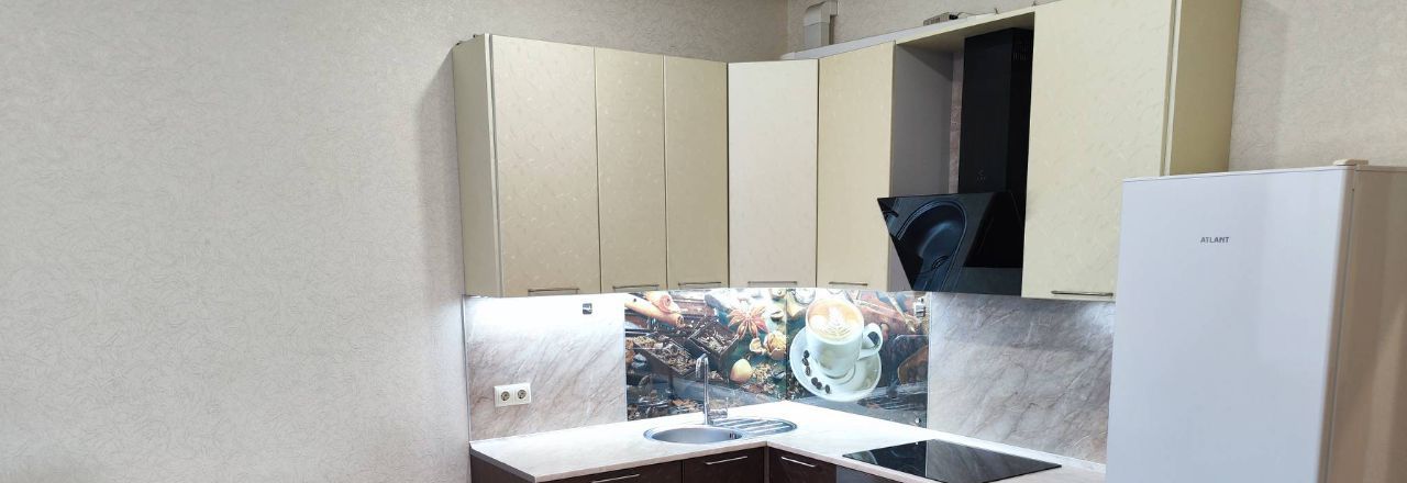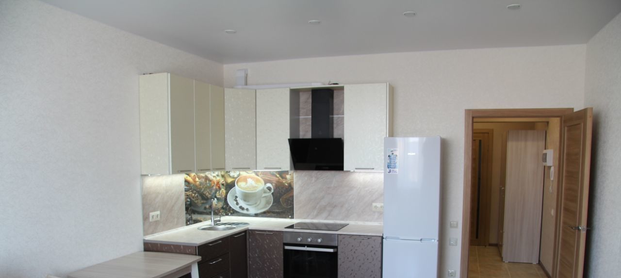 В комнате-кухне (25 кв.м.):кухонный гарнитур c керамической электроплитой, духовой шкаф, сенсорная вытяжка, холодильник, евротахта , тв тумба с телевизором и шкафчики.