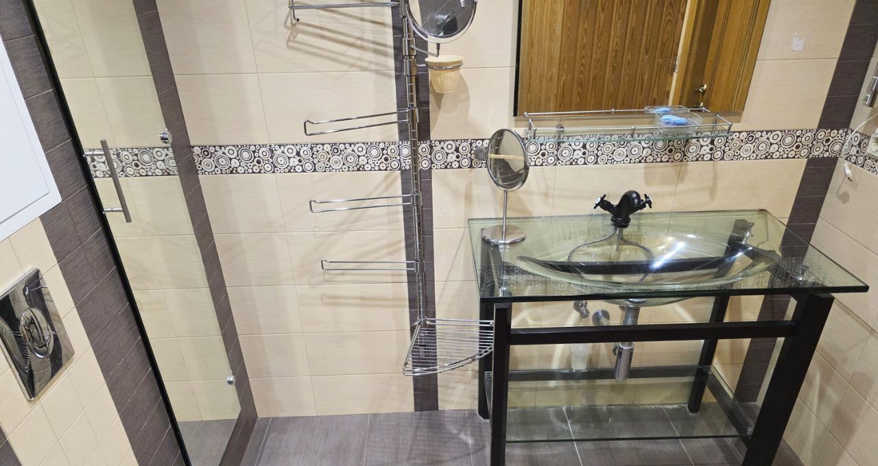 Дизайнерский стеклянный обеденный стол, прозрачная дизайнерская раковина в ванной, теплые полы в ванной и прихожей! Удобные вместительные шкафы-купе. Места для хранения!