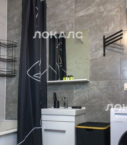 Современный санузел с ванной укомплектован стиральной машиной, полотенцами и фирменными косметическими наборами Flat Inn. Для удобства гостей предусмотрены Wi-Fi и вместительные системы хранения.