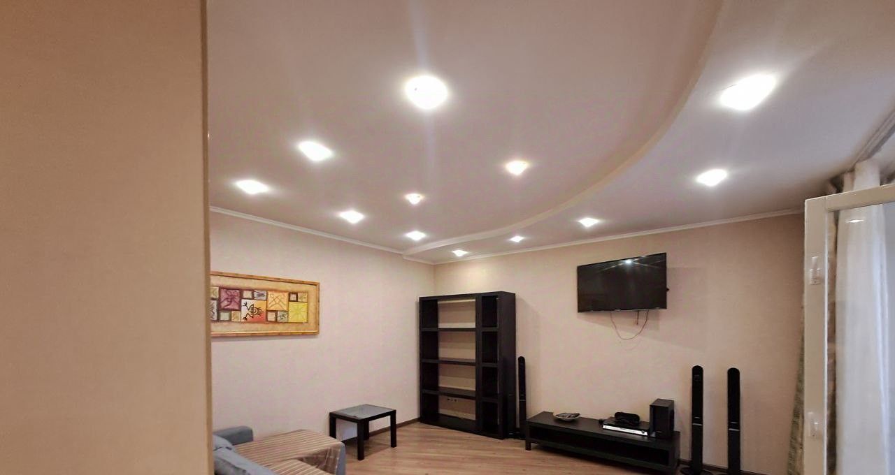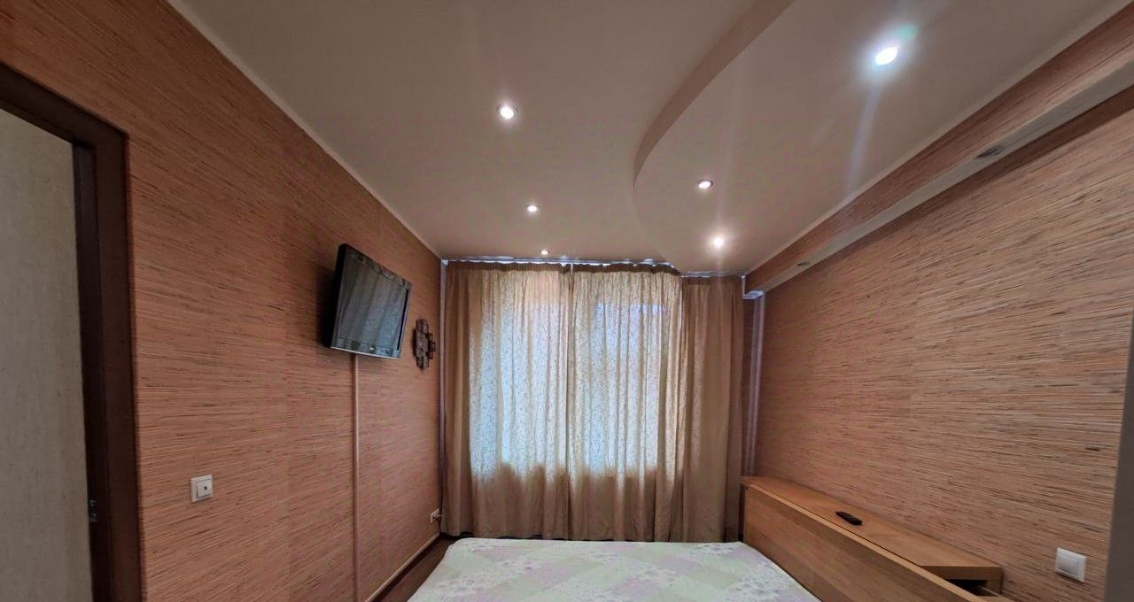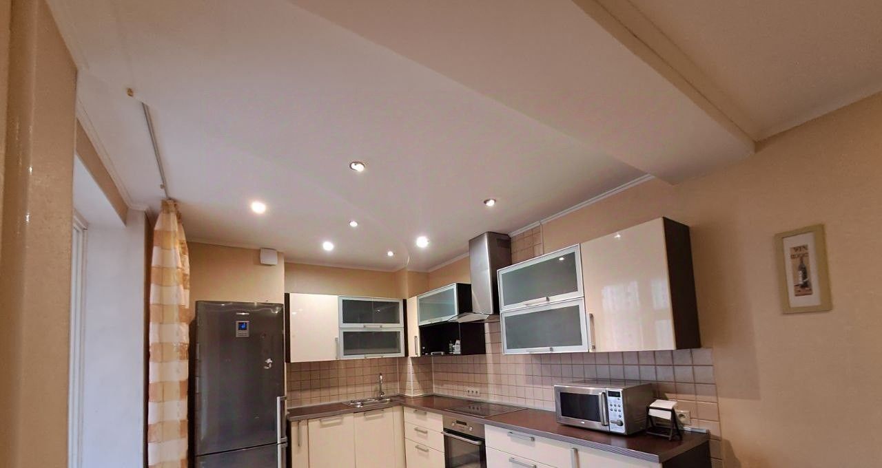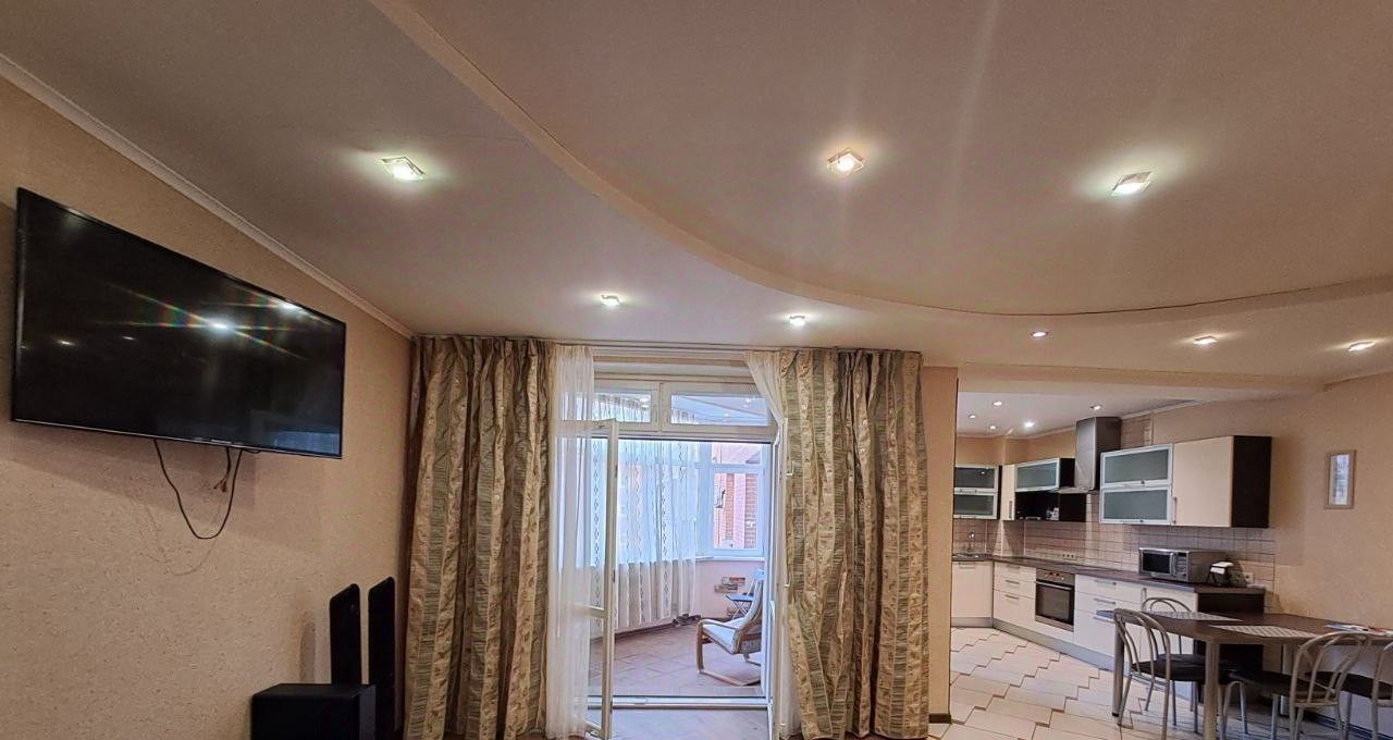 Кухня 10м2 совмещенная с гостиной 26м2 + спальня 16м2 с гардеробной. Есть вся необходимая мебель, техника, WiFi.