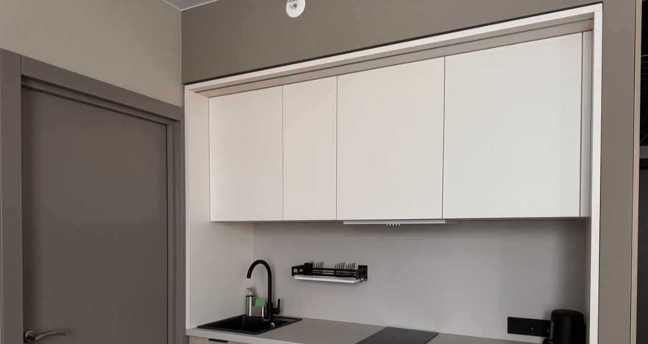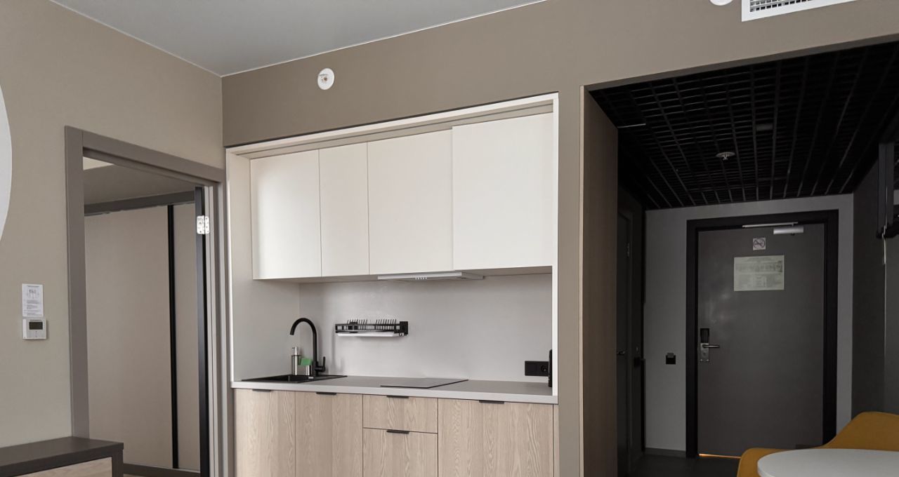 - полностью оборудованная кухонная зона с варочной панелью и холодильником