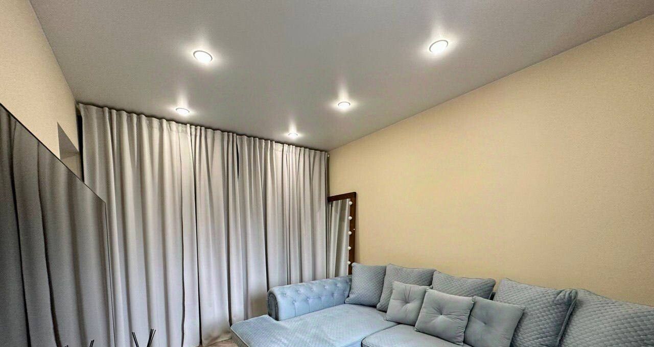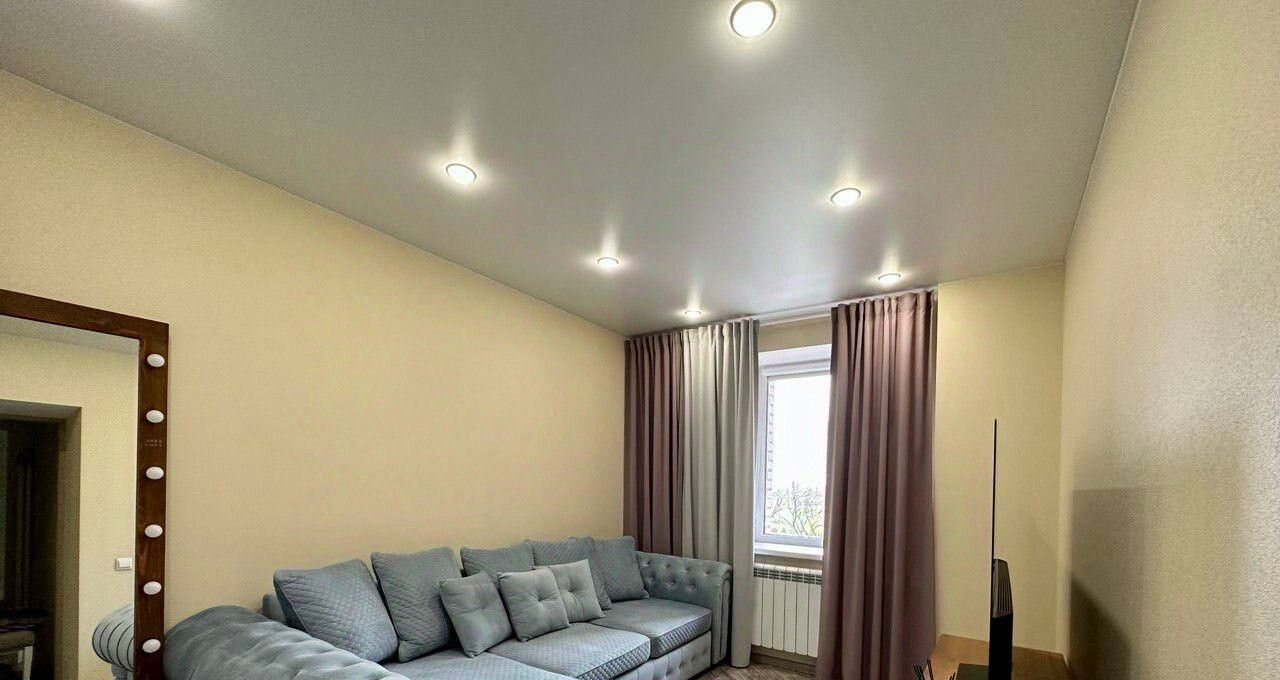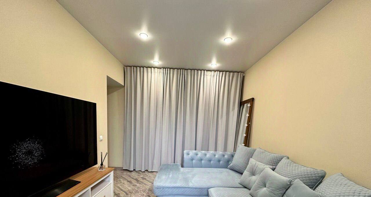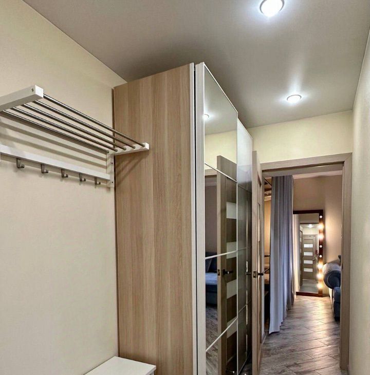 Гостиная: Идеальное место для отдыха у большого плазменного ТВ на раскладном диване. В вашем распоряжении просторная гардеробная система во всю стену и стильное гримерное зеркало из массива дерева.