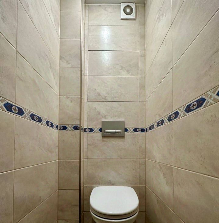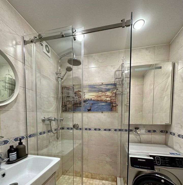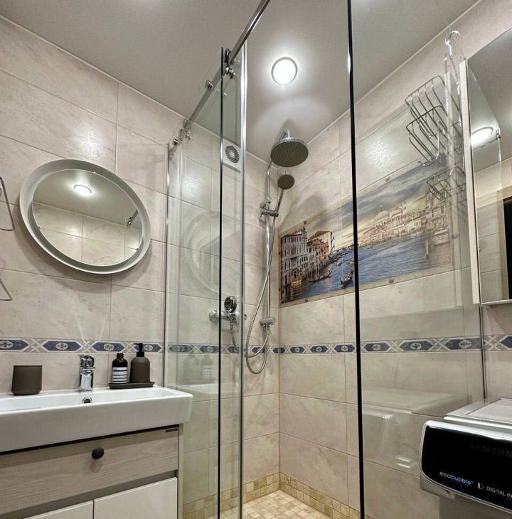 Ванная комната: Раздельный санузел. В ванной — современная душевая кабина с раздвижными дверями и стиральная машина Samsung.