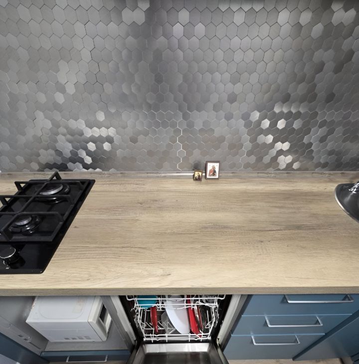 В квартире полностью оборудованная кухня с необходимой техникой и led-подсветкой (холодильник, варочная плита, духовка, микроволновка), набором посуды, столовыми приборами и т.д