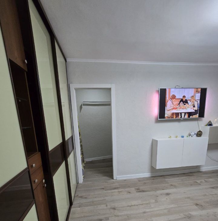 Гостиная оснащена всей необходимой мебелью (диван, стеллаж, телевизионная группа, большой встроенный шкаф-купе), smart TV. Вторая комната мебелируется под арендатора (предоставляется мебель для спальни или детской).