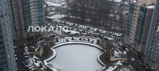 Вид на парк "Сосновка", Лахта центр, пруд и на внутренний двор с фонтаном.