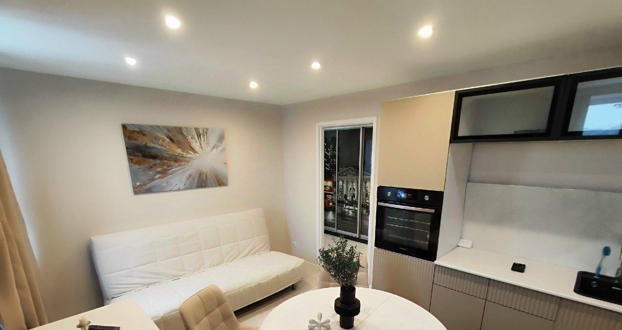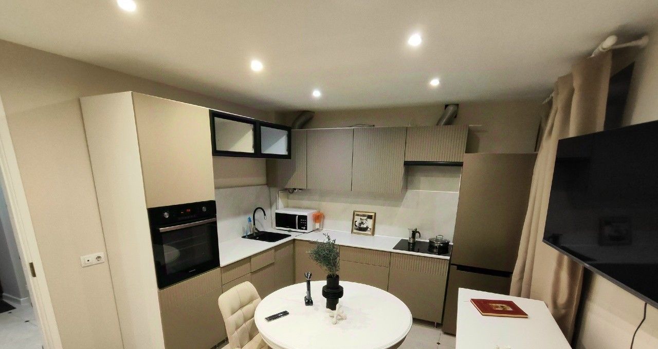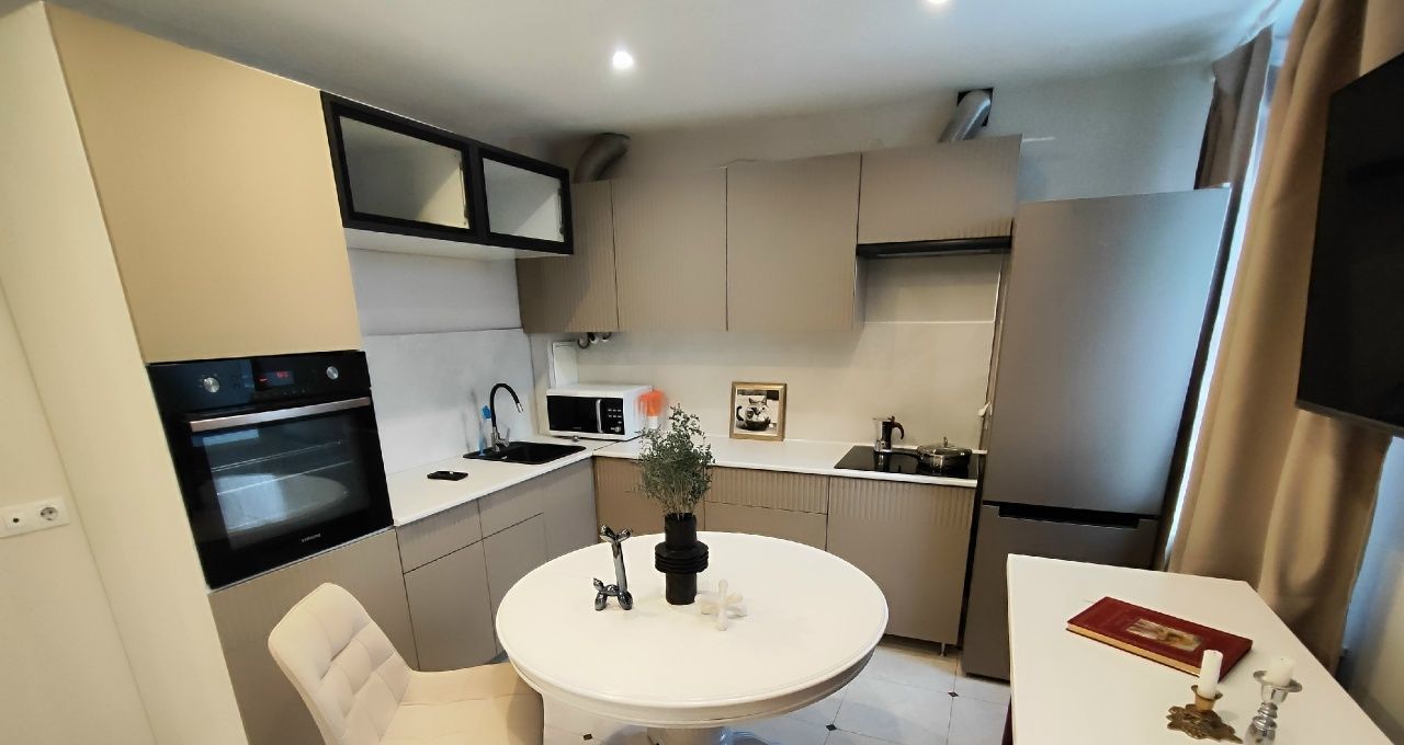 • Кухня/гостиная 14,5 м²: диван-кровать, кухонная мебель, холодильник, микроволновка, электрический чайник, посудомоечная машина, духовка, вытяжка, индукционная варочная поверхность, газовая колонка (горячая вода круглый год).
