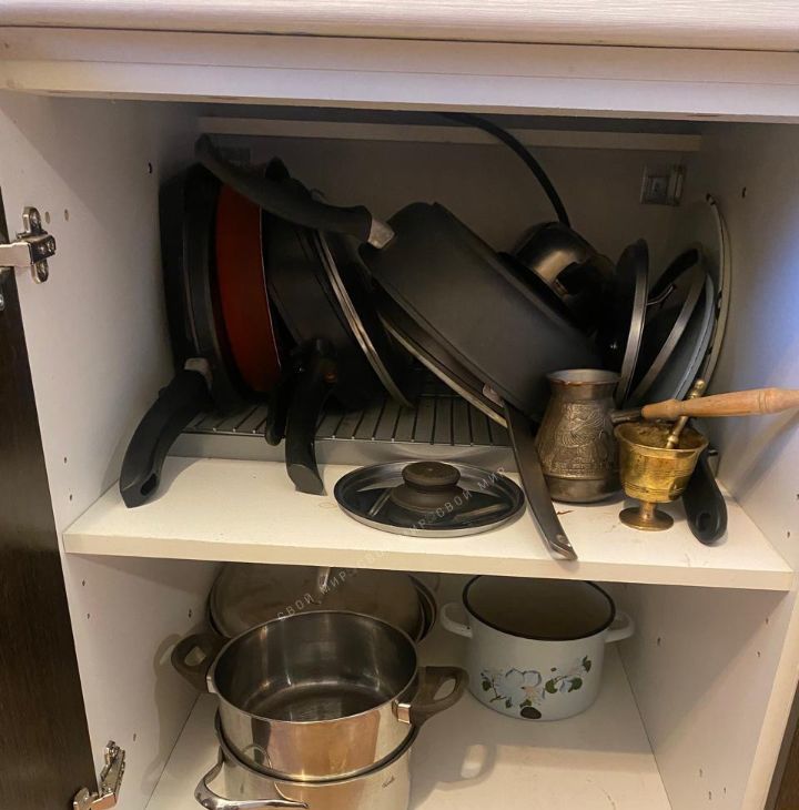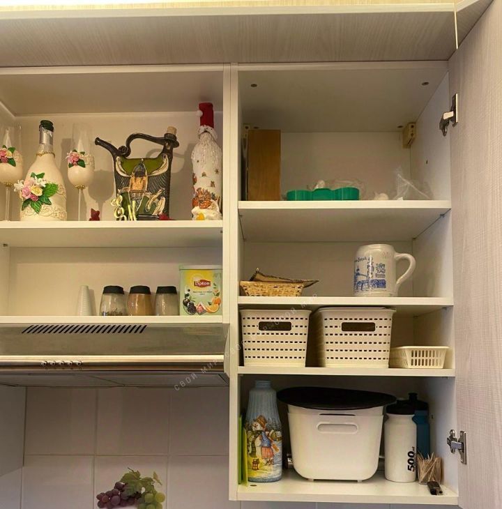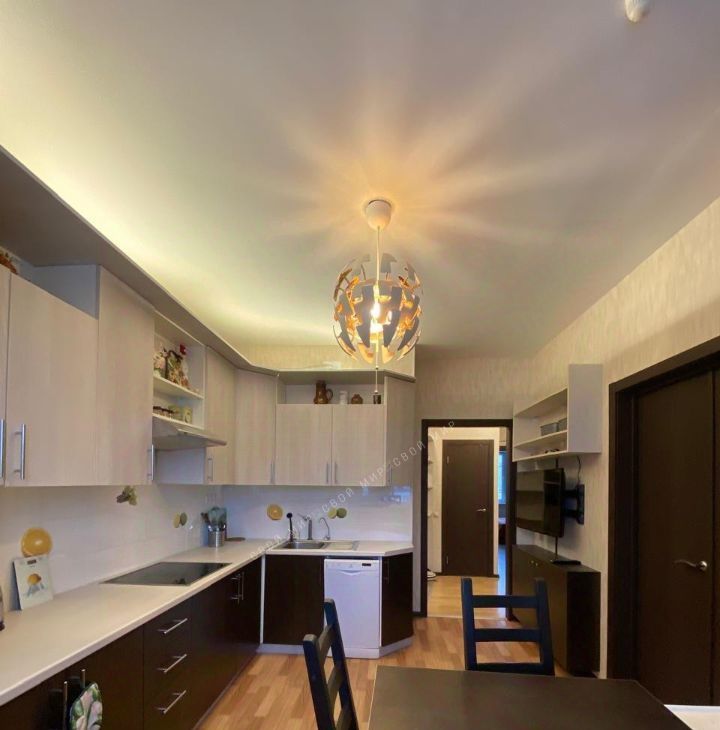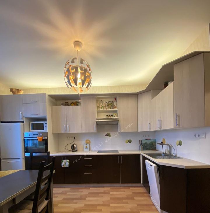 На кухне: диван двуспальный, кухонный гарнитур, холодильник, посудомоечная машинка, духовой шкаф, микроволновка, варочная поверхность, чайник и все необходимая посуда, кухонный стол, кухонные стулья. Из кухни в детскую сделан прямой широкий проход с распашными дверьми, что позволяет, находясь на кухне, оставаться в контакте с детьми.