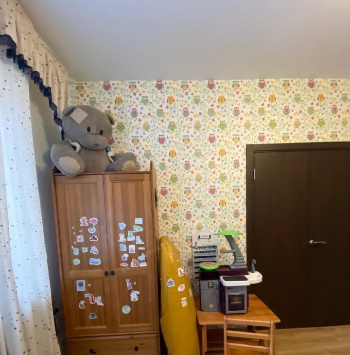 В детской комнате: две детские кроватки, платяной шкаф, мебель для хранения игрушек и детских вещей.