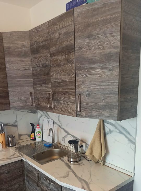 - кухонный гарнитур с мойкой и варочной панелью, много шкафчиков и полочек для хранения