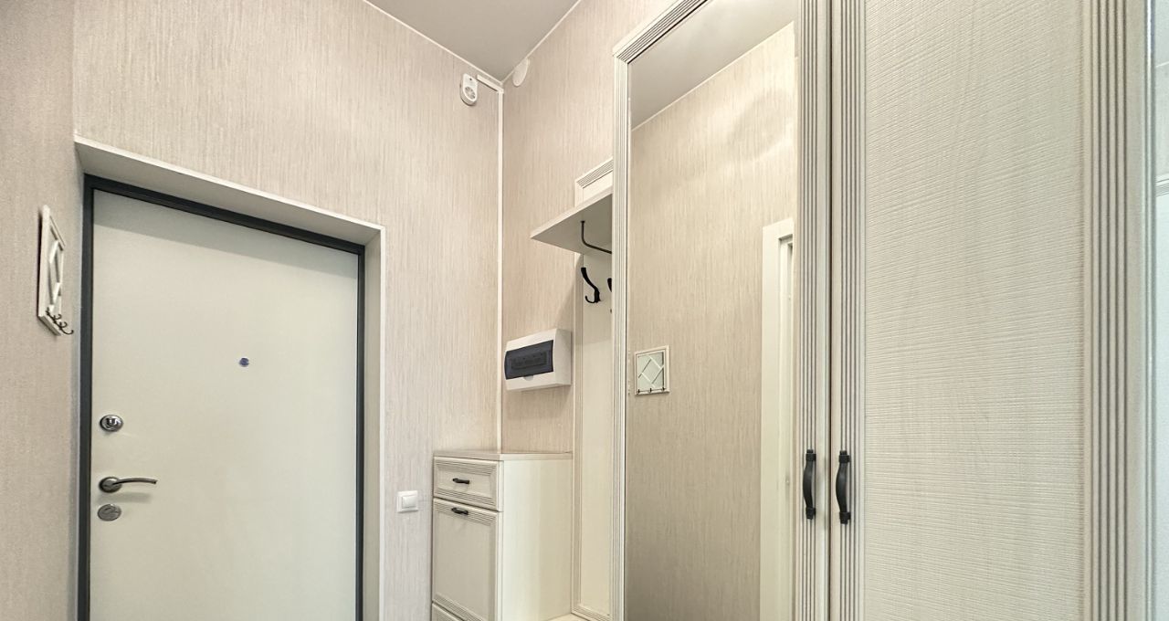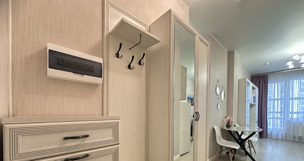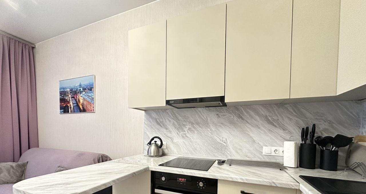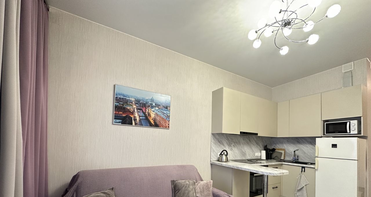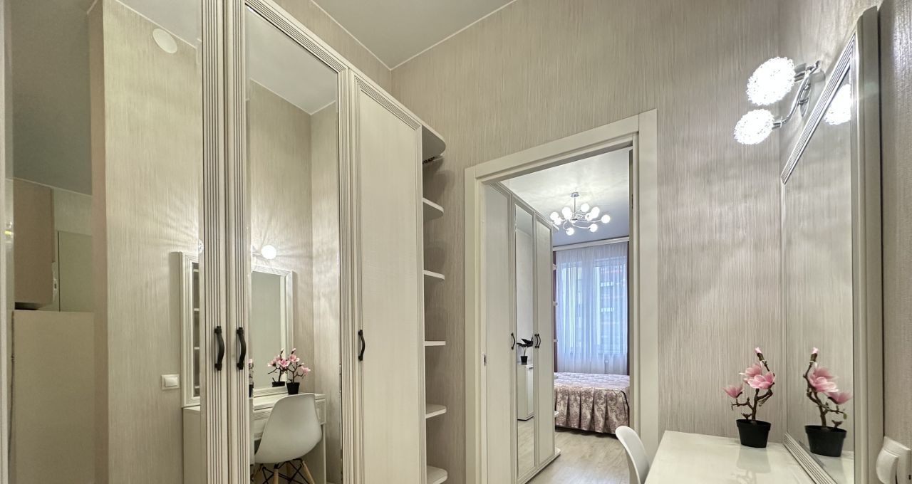 Апартаменты состоят из нескольких помещений - спальня с двуспальной кроватью 160 см на 200 см, платяным шкафом с зеркалами, комодом и двумя прикроватными тумбочками, кухня-гостинная с современным двуспальным диваном (спальное место 160 см на 200 см), современной белоснежной стенкой, телевизором SONY. Кухня укомплектована обеденной группой холодильником , индукционной варочной панелью, духовым шкафом, микроволновой печью, вытяжкой. При входе полноценная прихожая с зеркальным шкафом и обувницей. В помещении между комнатами - вместительный шкаф с зеркалами, туалетный столик. Имеется лоджия с панорамным остеклением, из которой с 12 этажа открывается прекрасный вид на Пулковский парк.