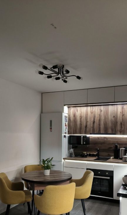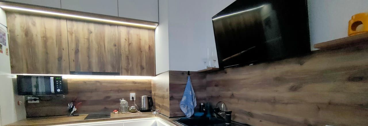 Кухня(12м): просторная и светлая, встроенный кухонный гарнитур с подсветкой, посудомоечная машина, СВЧ-печь, духовка, индукционная плита, мультиварка, наборы кастрюль, сковородок, тарелки, кружки, бокалы для разных напитков, чайник, смарт тв 49', Яндекс станция мини, круглый раскладной стол, кресла-стулья, диванчик (можно разложить для гостей)