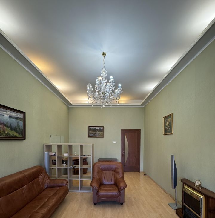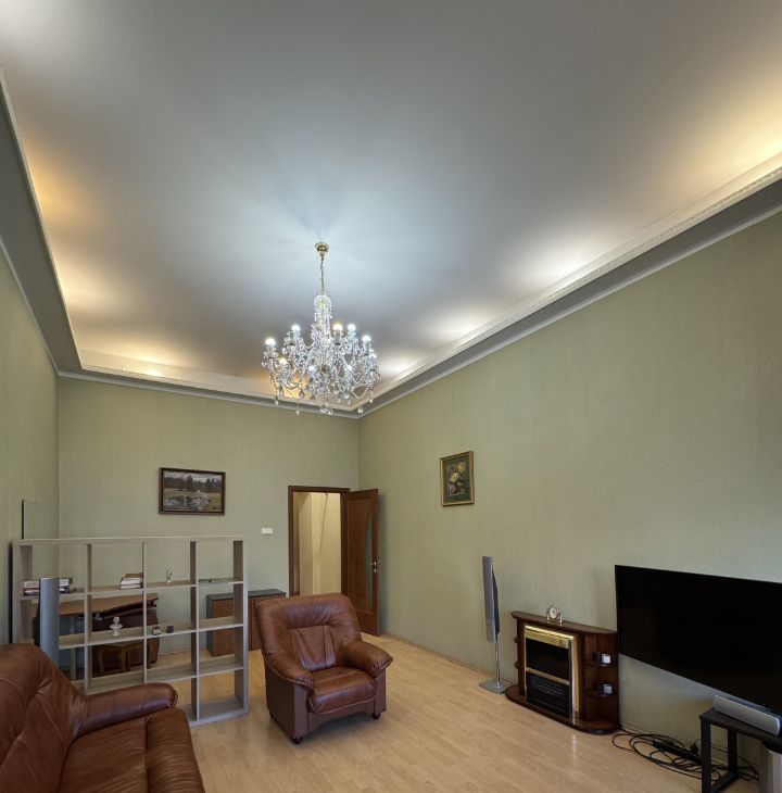 Высокие потолки, в квартире много света, теплая. Хорошая шумоизоляция.