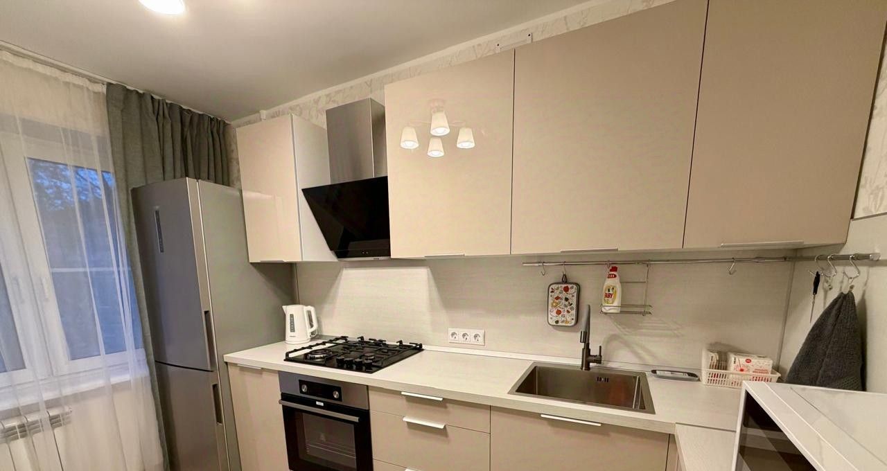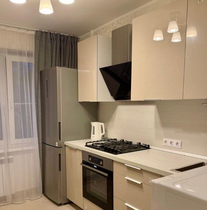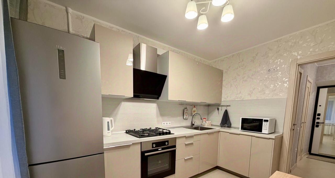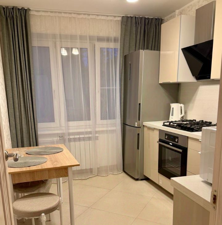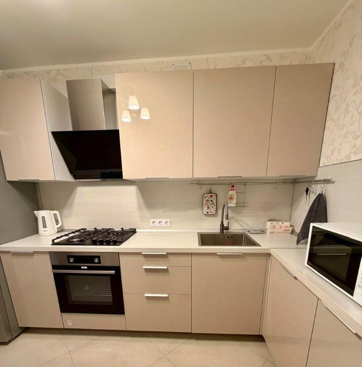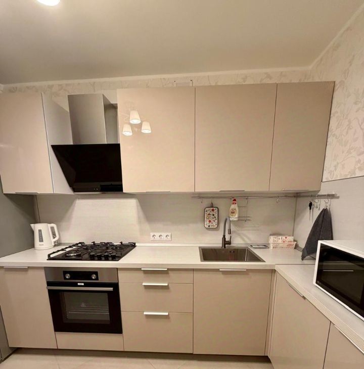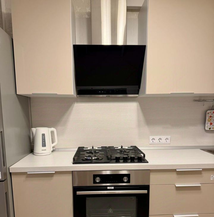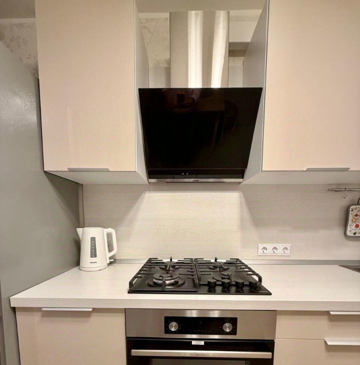 Кухня оборудована всей необходимой техникой: плита, духовка, холодильник, чайник, микроволновая печь.