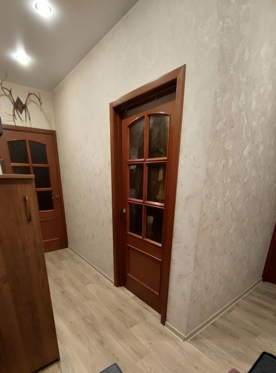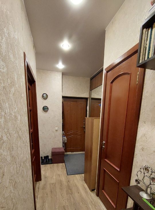 В прихожей встроенный шкаф из 3-х отделений с ящиками для хранения вещей одна дверь это зеркало от пола до потолка, что визуально увеличивает пространство.