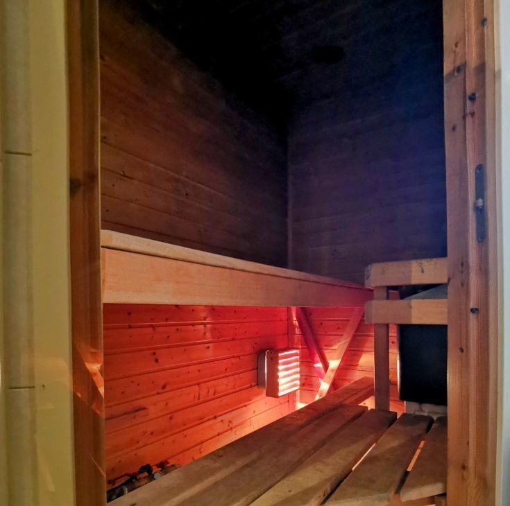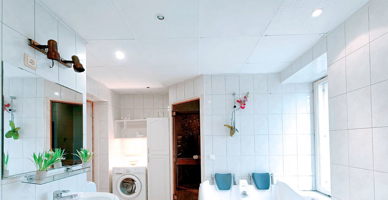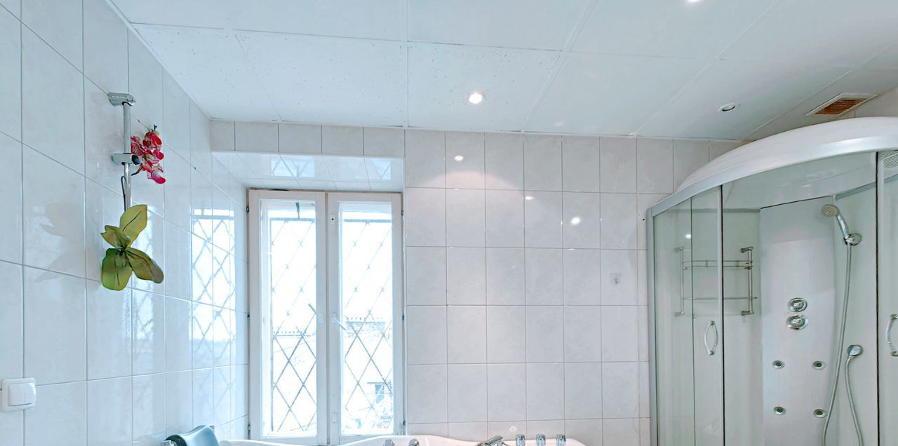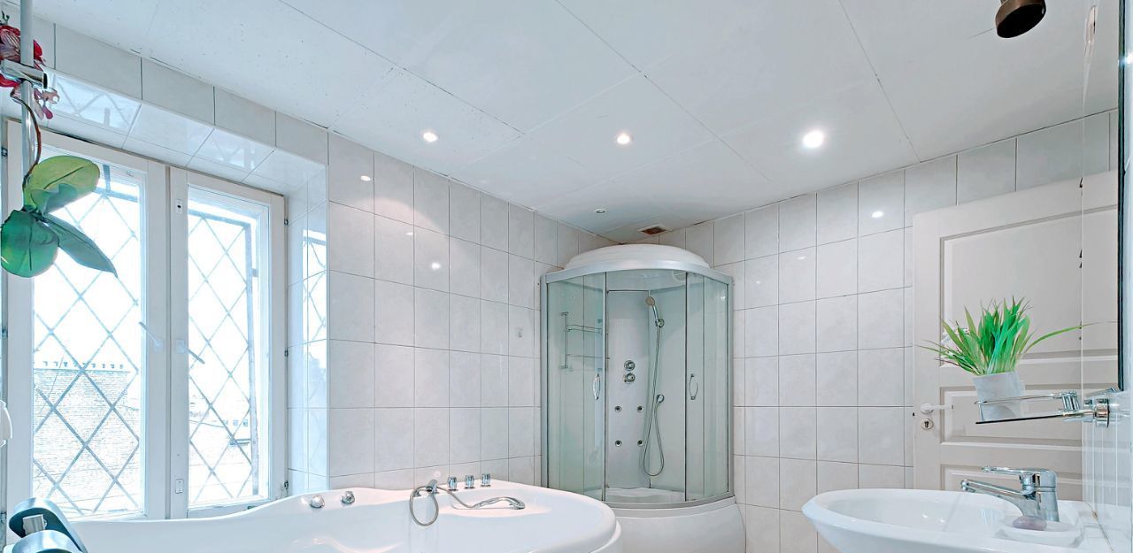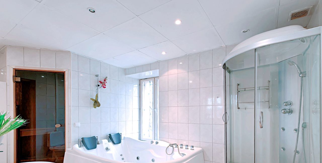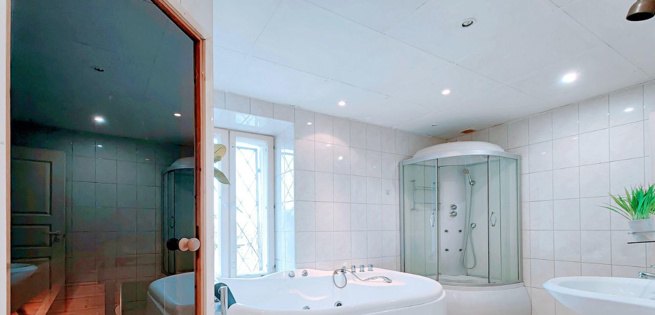 -Ванная комната с окном: Джакузи, Сауна, Душевая кабина, туалет.