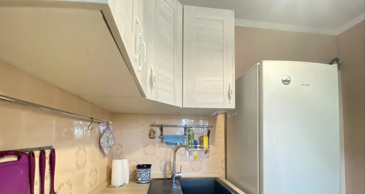 Полноценная кухня с газовой варочной поверхностью, холодильником, СВЧ печью, электрочайником и всей необходимой посудой