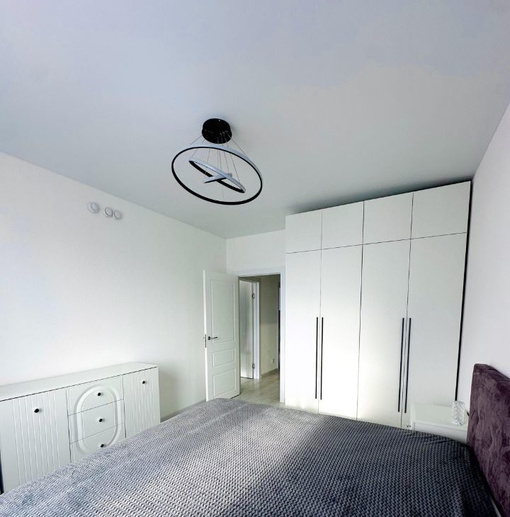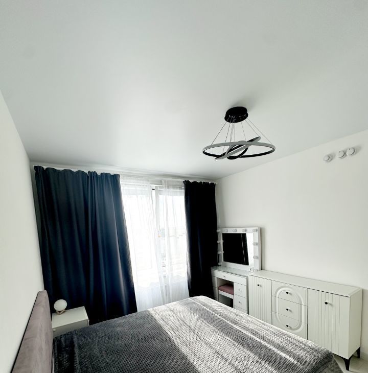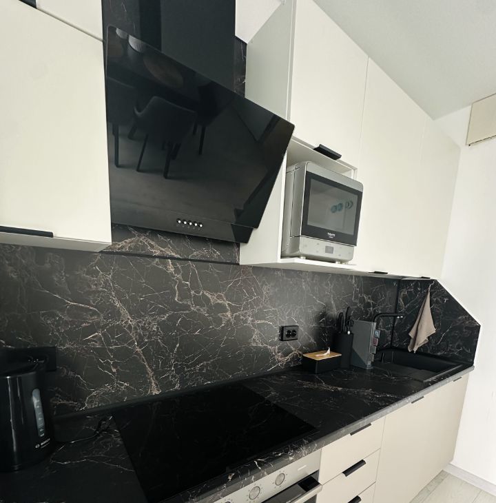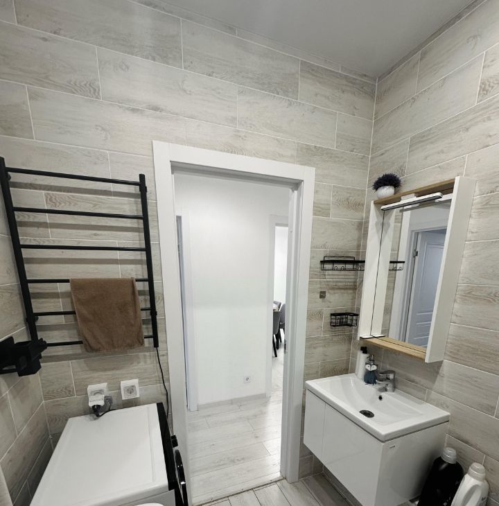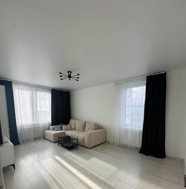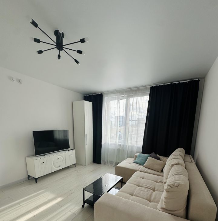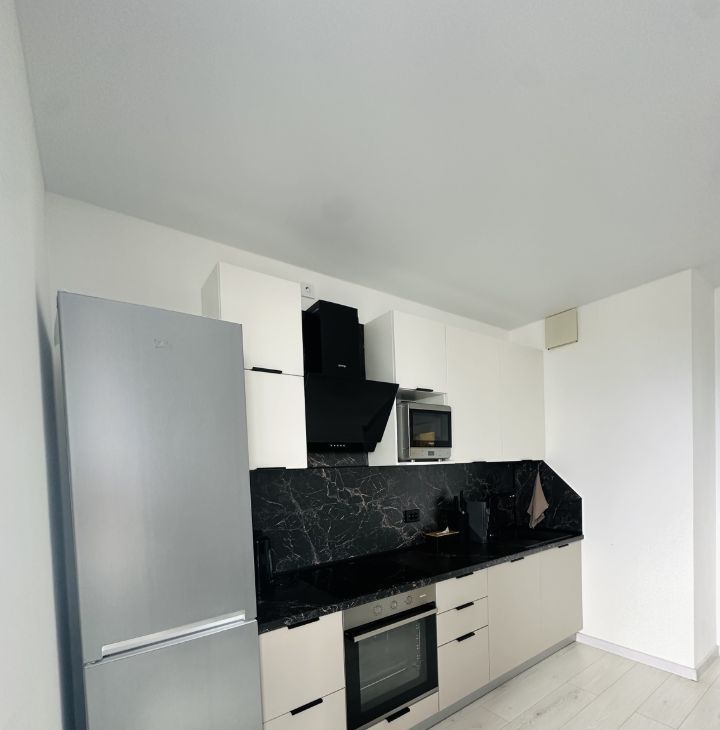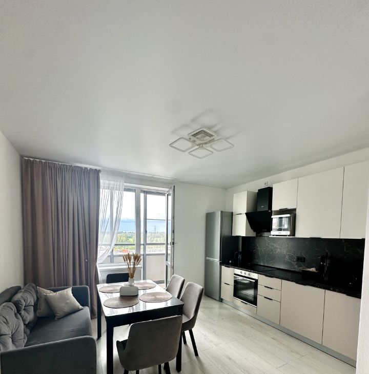 Квартира с евро ремонтом, комнаты изолированные. В гостиной установлен большой диван и телевизор. Кухня оборудована всей необходимой техникой: холодильник, плита, микроволновая печь и посудомоечная машина. Обеденная зона оформлена в современном стиле.