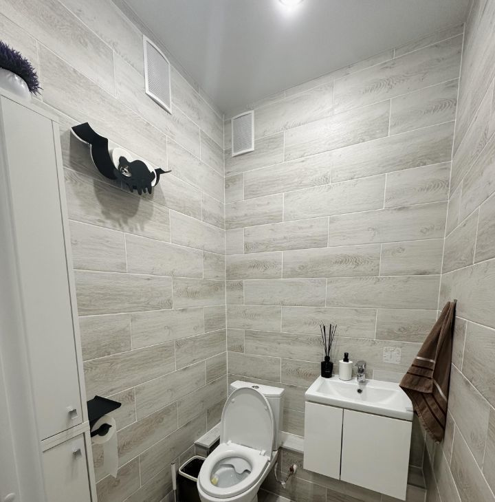 В спальне просторная кровать, вместительный шкаф и тумбочка. Ванная комната и туалет раздельные, выполнены в светлых тонах.