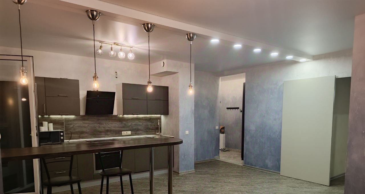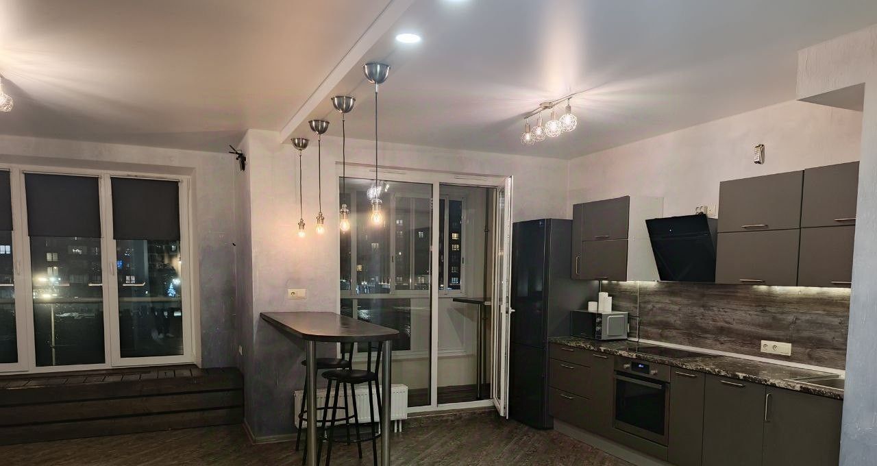 Кухня соединена с гостиной, удобно для повседневной жизни и гостей. Оборудована посудомойкой и электроплитой, есть барная стойка. Зал и спальню разделяет раздвижная дверь на роликах.