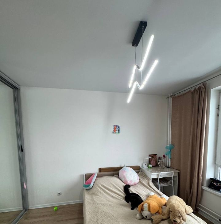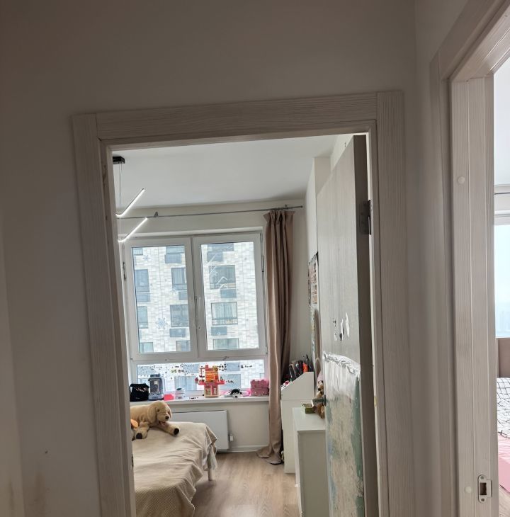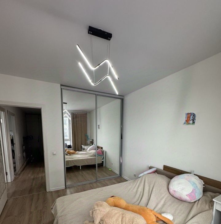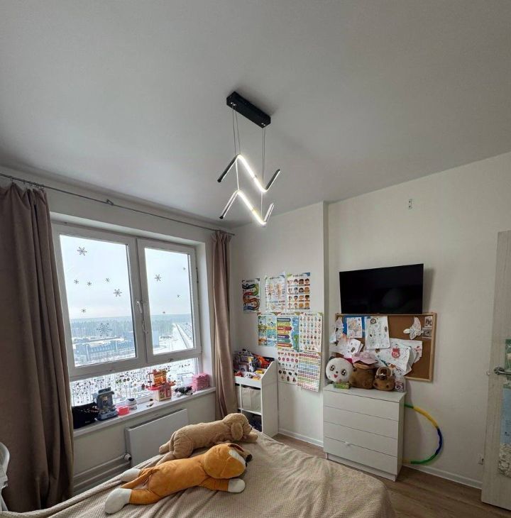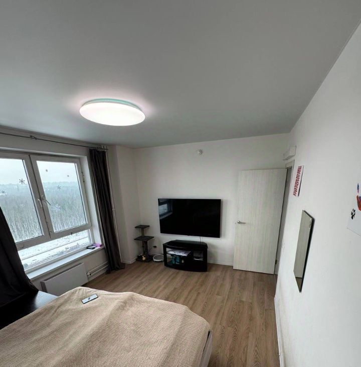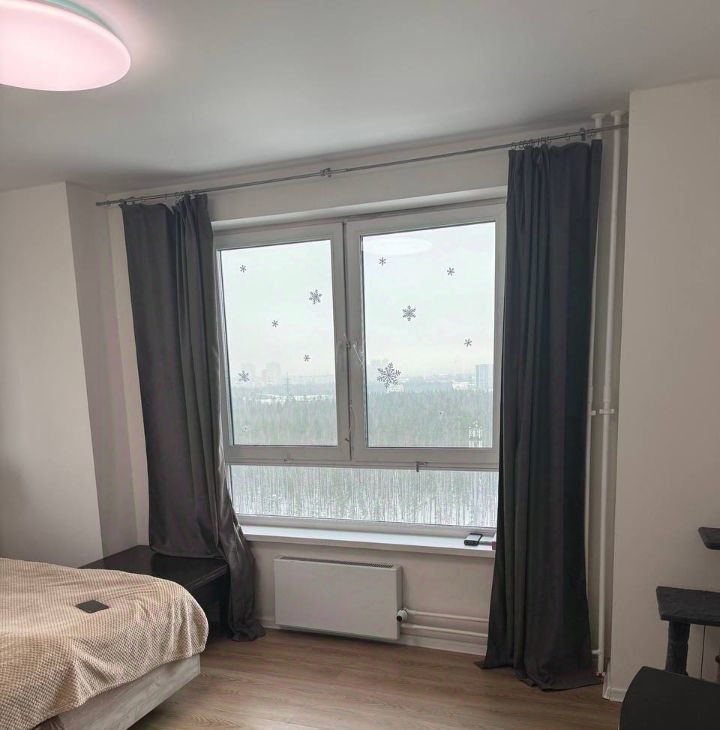 *Спальня(для кого-то, как и у нас раньше, может быть, гостиной) с двумя видовыми окнами на северо-восток(закатная сторона) и обзором 270 градусов. Кровать 180*200 фирма МатрасовЪ. Матрас 1000 пружин на квадратный метр - МатрасовЪ. Умная люстра Xiaomi, телевизор LG Nanocell 4к 65 дюймов. Выведена трасса в декоративный короб на фасад здания для подключения кондиционера.